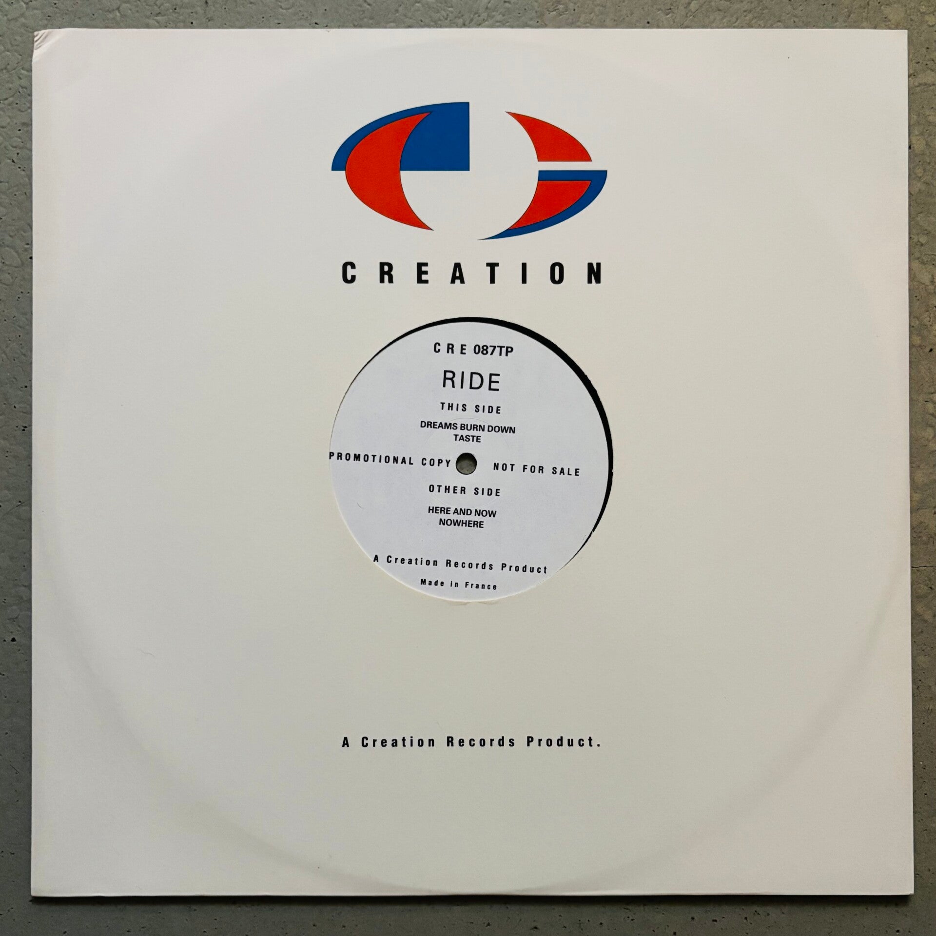 White label promo copy of Ride’s groundbreaking third EP that spawned the classic shoegaze anthems ‘Dreams Burn Down’, ‘Taste’ and ‘Nowhere’. History in the making. Record and sleeve near mint.
