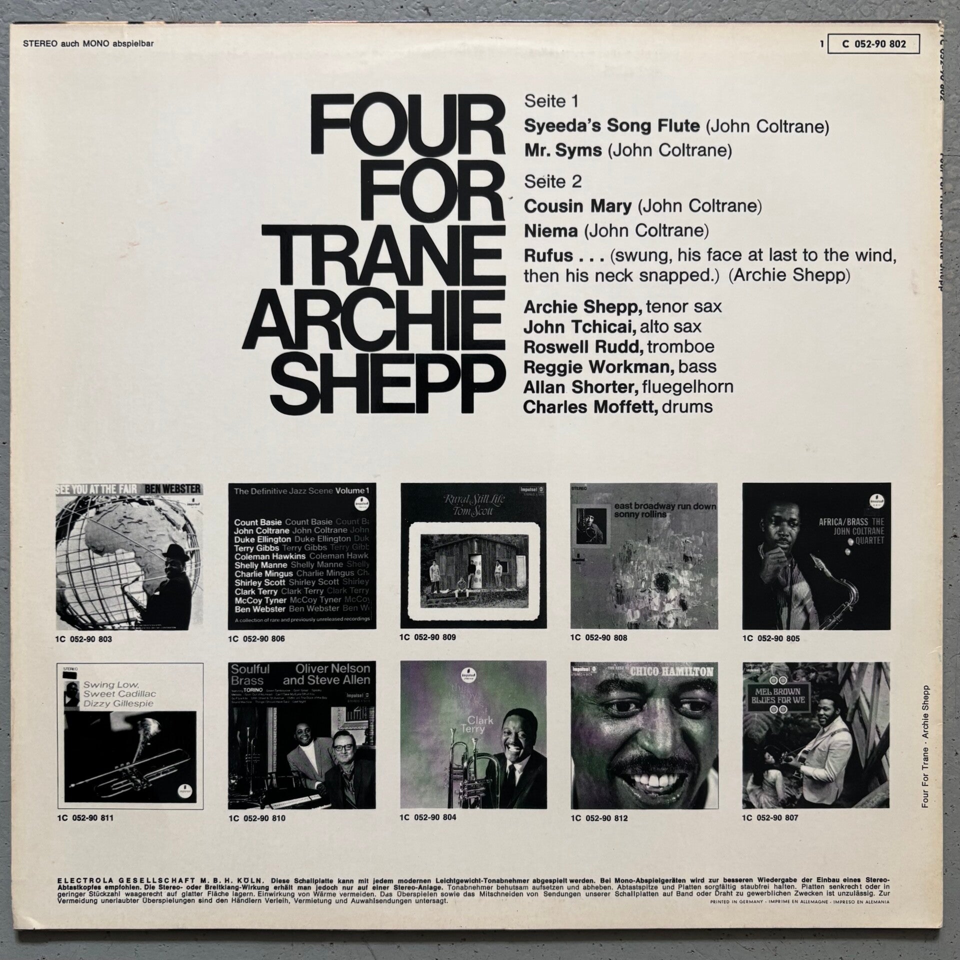 Beautiful near mint light blue 1969 German EMI/Columbia pressing of Archie Shepp's brilliant ode to Coltrane. Glossy sleeve a strong VG+. A total treat.