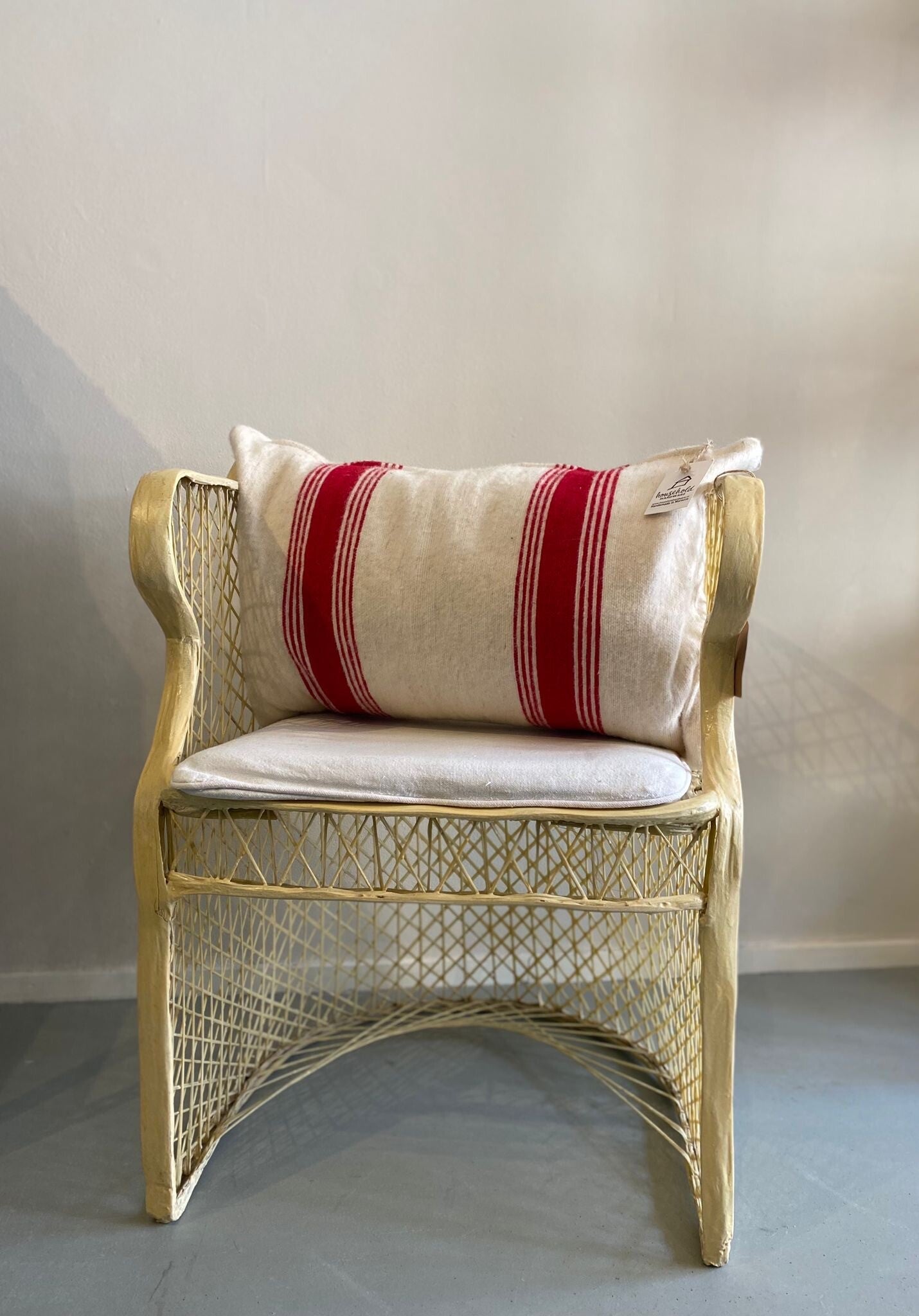 This comfortable soft beige and red striped cushion is handmade from vintage kelim fabric and fits on any sofa, armchair or bed. The design of each kelim cushion is unique.