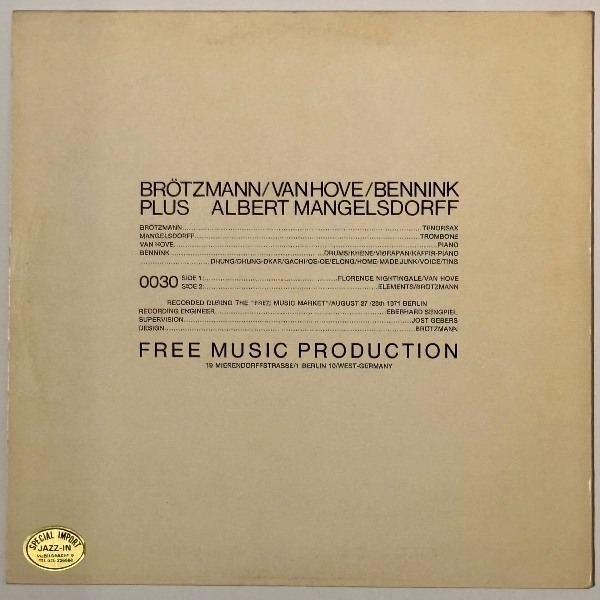 mmaculate copy of avantgarde improv jazz giants Peter Brötzmann, Fred van Hove, Han Bennink and Albert Mangelsdorff highly energetic sonic attack at Berlin’s Free Music Market in the summer of ‘72 - yet another free jazz grail!