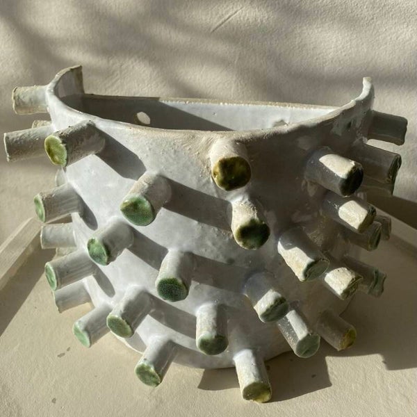Unique handmade wall lamp made of white glazed ceramic with protrusions and green tips. The lamp is easy to mount to the wall using two screw holes. Beautiful in the bathroom, garden, or kitchen.