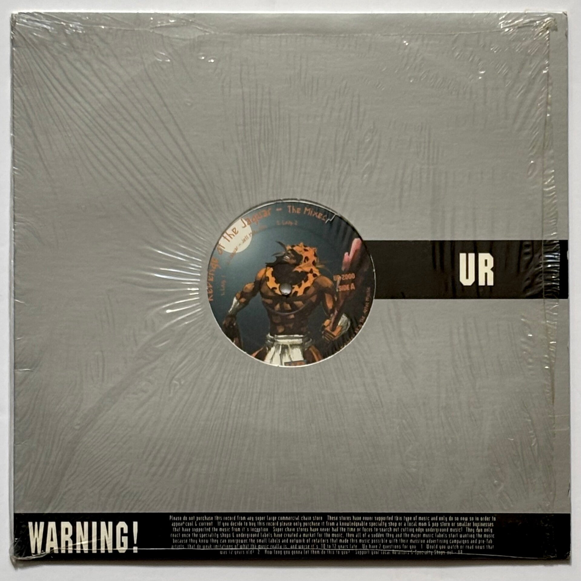 Great copy of ‘Revenge of the Jaguar’, the heavily sought after 2000 remix EP that featured three new versions of the monumental ‘Knights of the Jaguar’ that was released a year earlier. Now classic remixes by Jeff Mills, Octave One and Underground Resistance label boss Mike Banks. Record VG+ with one superficial scuff, shrinkwrap still on UR sleeve.