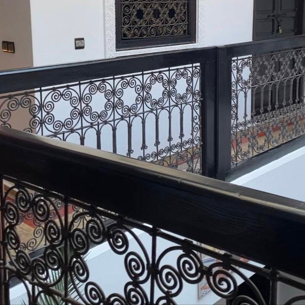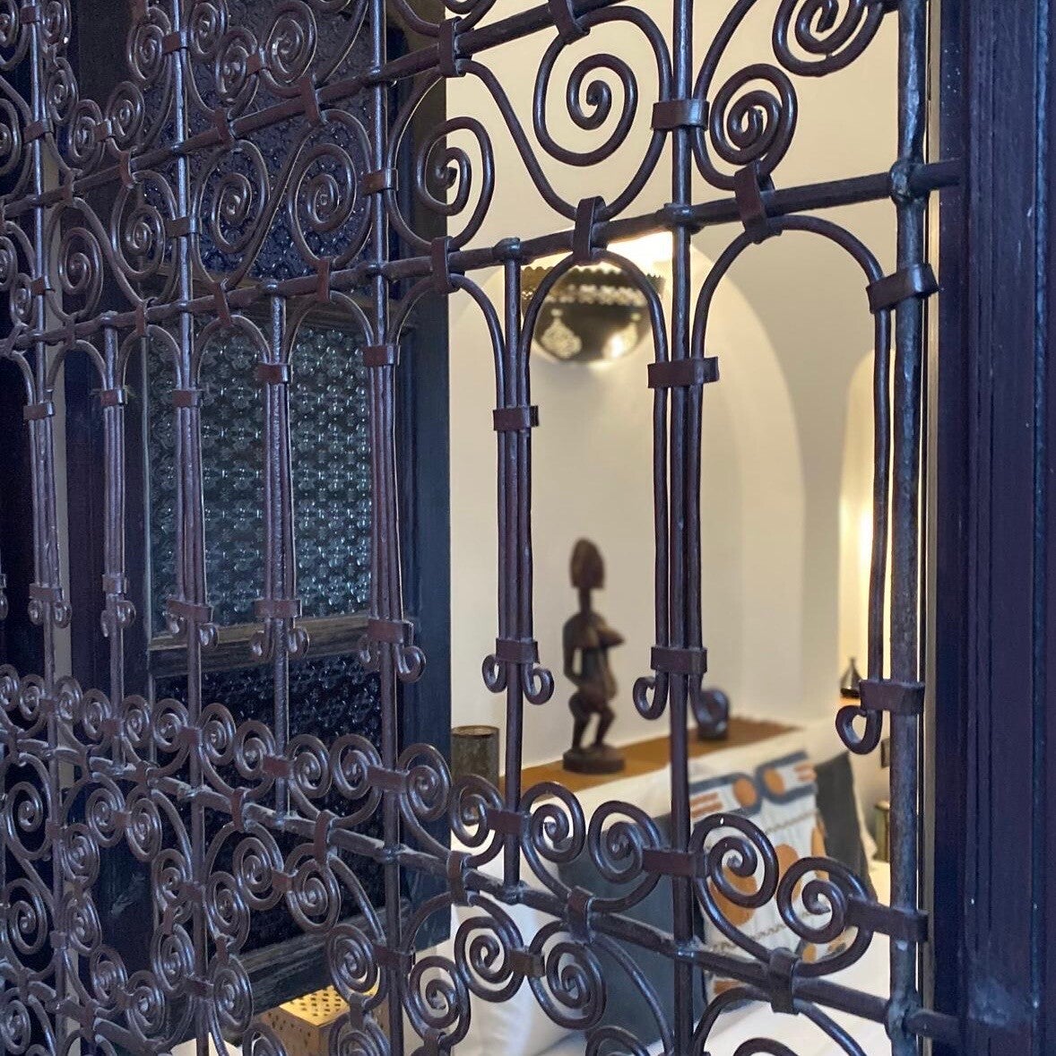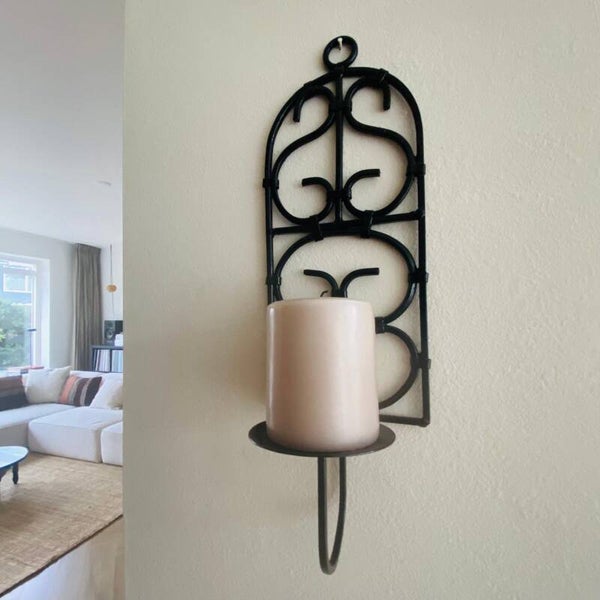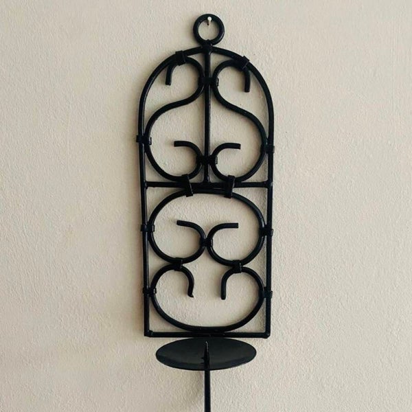 Elegant handcrafted wrought iron and black metal wall sconce from Morocco. Suitable for indoor use, but also great outdoors in the garden. A candle can be placed on the skewer.