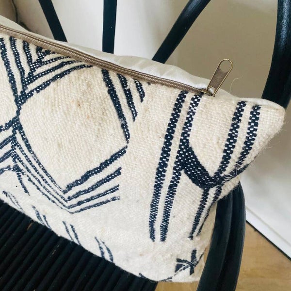 This black and white Boujaad cushion is handmade and comes straight from the souks of Morocco. Crafted from vintage carpet from the Boujaad region in the Atlas Mountains, the cushion features an off-white color and a traditional black woven pattern. The front is 100% wool, the back is white cotton, adorned with a beautiful brass zipper.