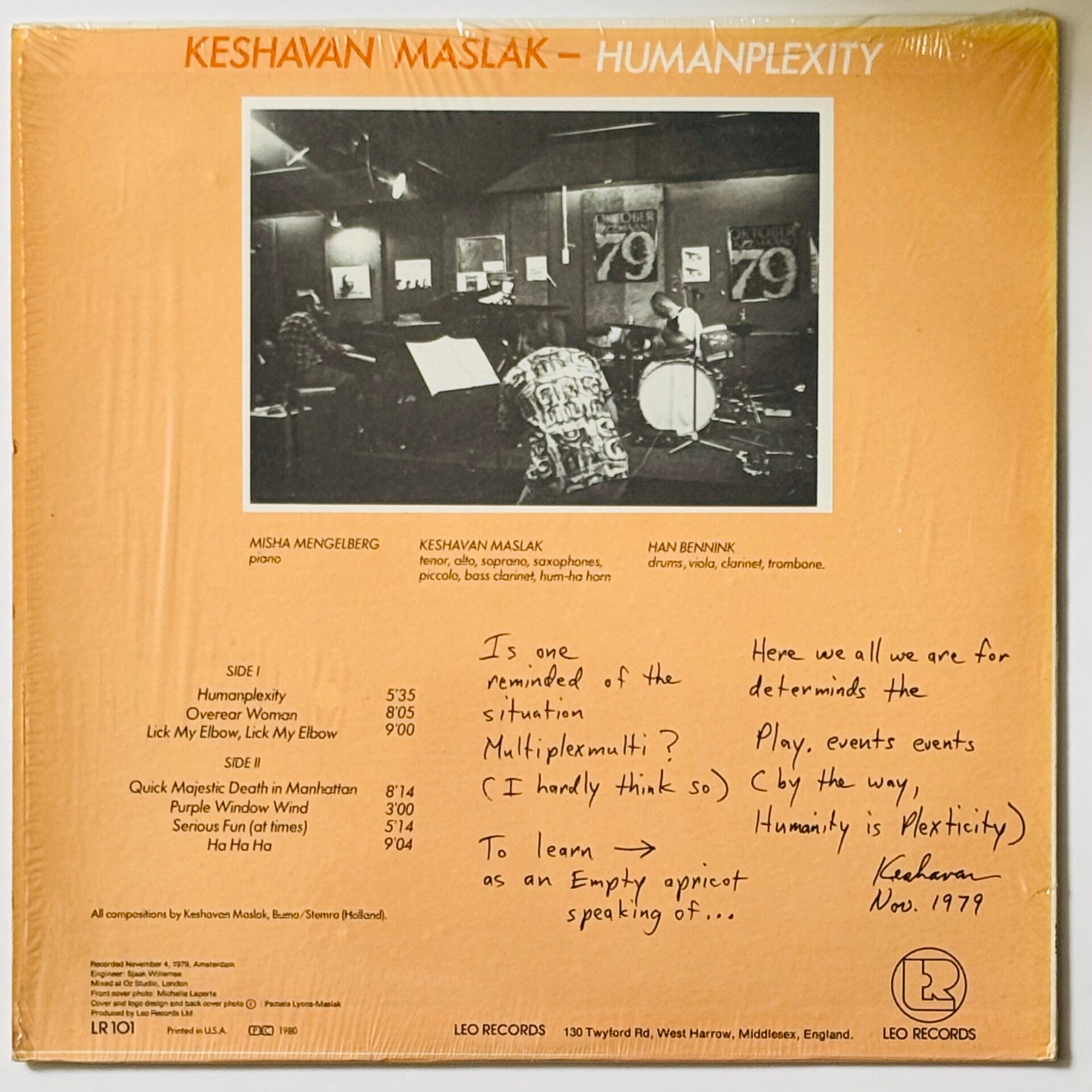 Nice near mintish archive copy of Han Bennink and Misha Mengelberg’s 1980 album ‘Humanplexity’ that was recorded alongside American poet, jazz musician and performance artist Keshavan Maslak. Shrinkwrap still on sleeve.